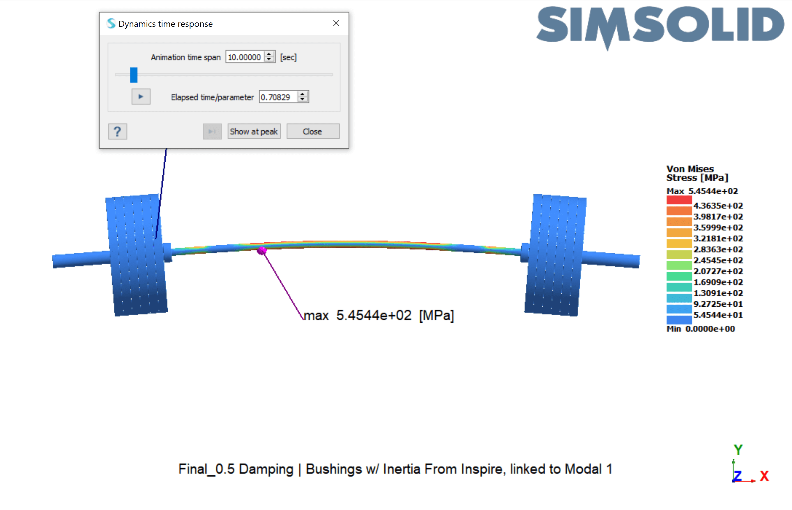 During the 0.5 damping run, stress results were 545 MPa, showing that more damping led to less deflection, meaning less stress.