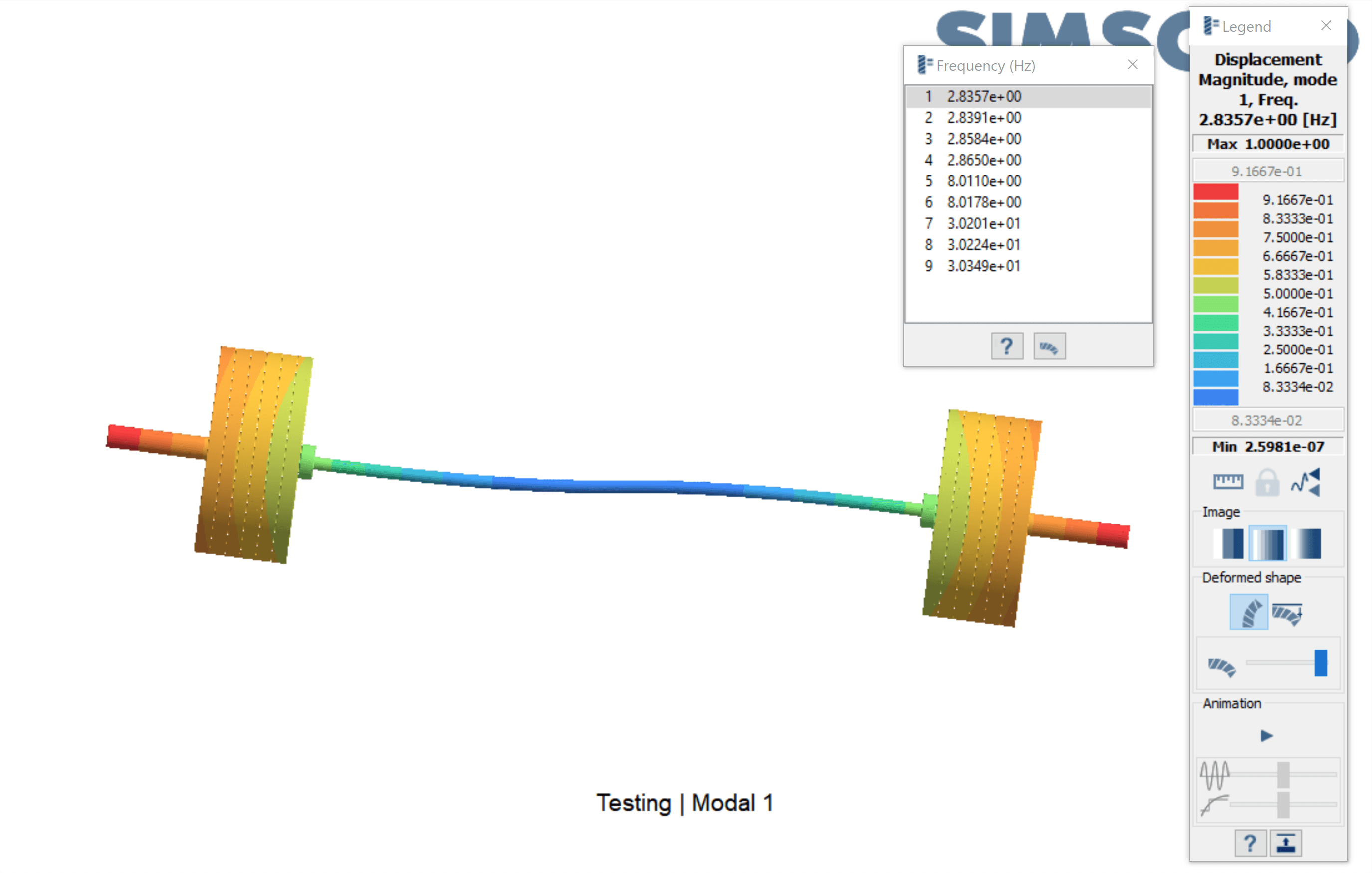 A different approach was used after reviewing the first simulation results. The immovable support located in the middle of the bar wasn’t realistic because of the stress concentration it caused (with stress levels of 1186 MPa). The underdamped vibration led to unrealistically large deflections, so the next step was to apply more realistic constraints and more damping.