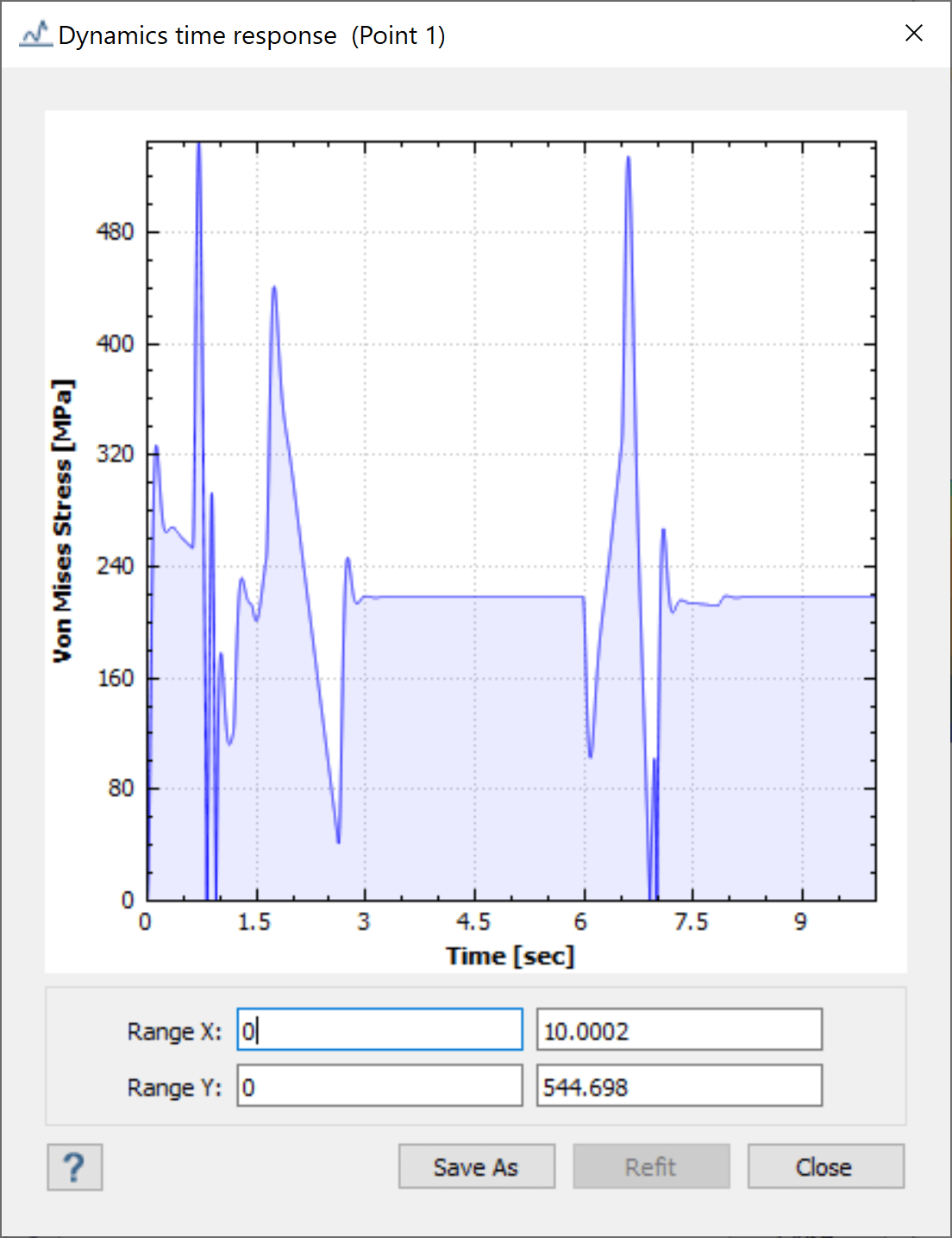 The stress results over the time of the lift presented that the full motion included very quick peaks and a static stress of around 220 MPa.