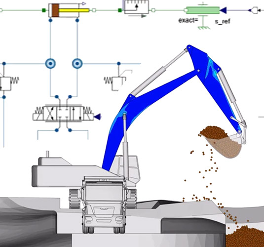Create detailed hydraulic circuits and actuation systems as part of multi-disciplinary system simulations – particularly for heavy machinery and agricultural equipment, in combination with multi-body systems and granular material systems.