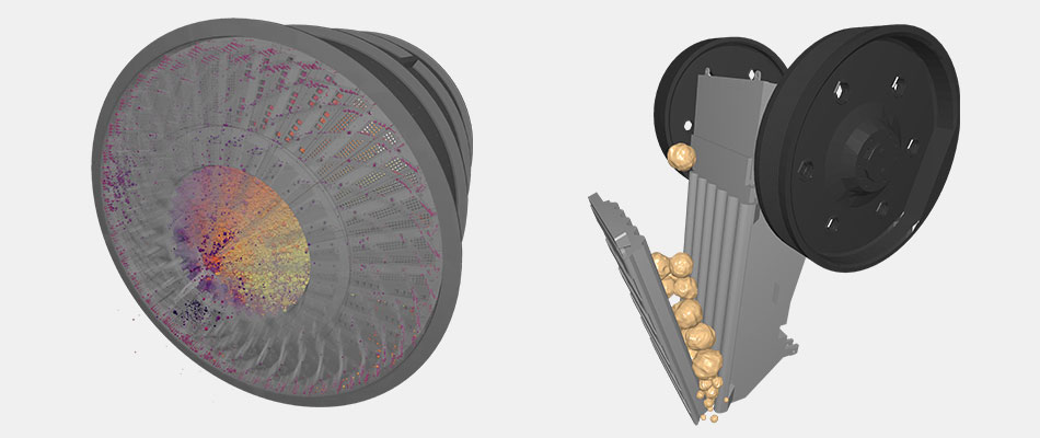 Tractors, combines, and forage harvesters are all designed to work with a range of granular materials such as crops, seeds and soils, all of which may vary in properties depending on the location and seasonal conditions. The variability of these materials can have a strong effect on the performance of the machines. EDEM can predict the flow of those materials and identify risks of blockages, wear, and crop damage. It can be combined with multi-body dynamics tools such as Altair® MotionSolve® to model crop-machine and soil-machine interactions, and predict equipment response for various materials.
