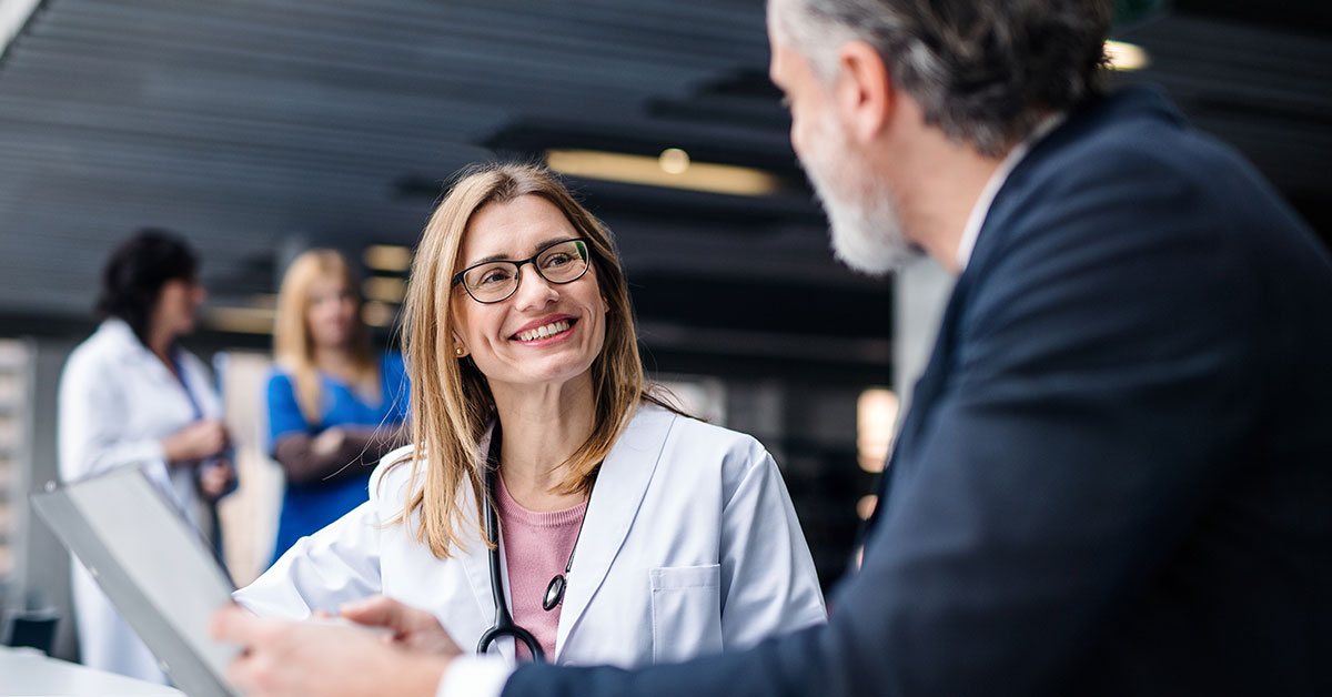 Two female customer satisfaction specialists at a large US-based insurer confer about new methods for identifying clients most likely to churn using Altair insurance analytics software.