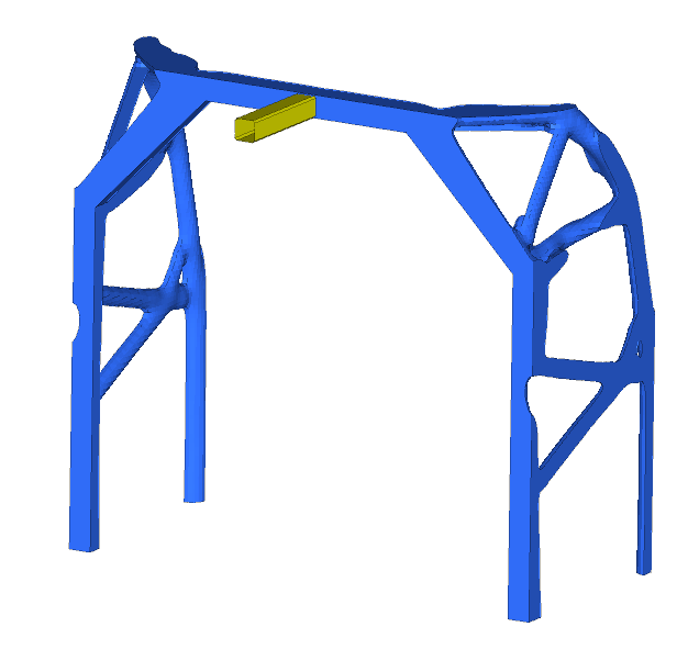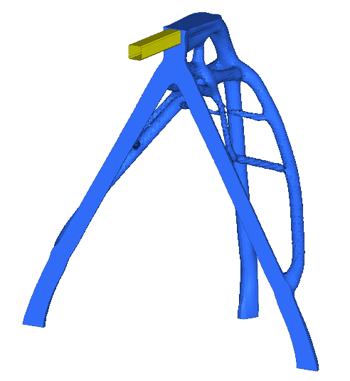 Sometimes it’s possible to completely re-design the architecture of the structure and start from a clean slate. 3D topology optimization will identify the optimal load-paths from the design space available based on the loading scenarios set and the defined constraints.For the considered structure, the design space is shown in blue. The inside of the structure was left open, just like the original design. The overhanging tube was excluded from the 3D topology optimization, as it does not affect the overall load-paths.