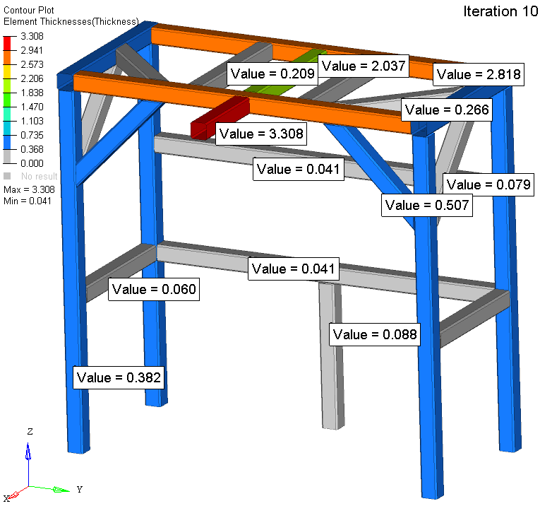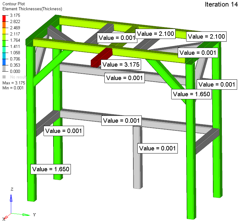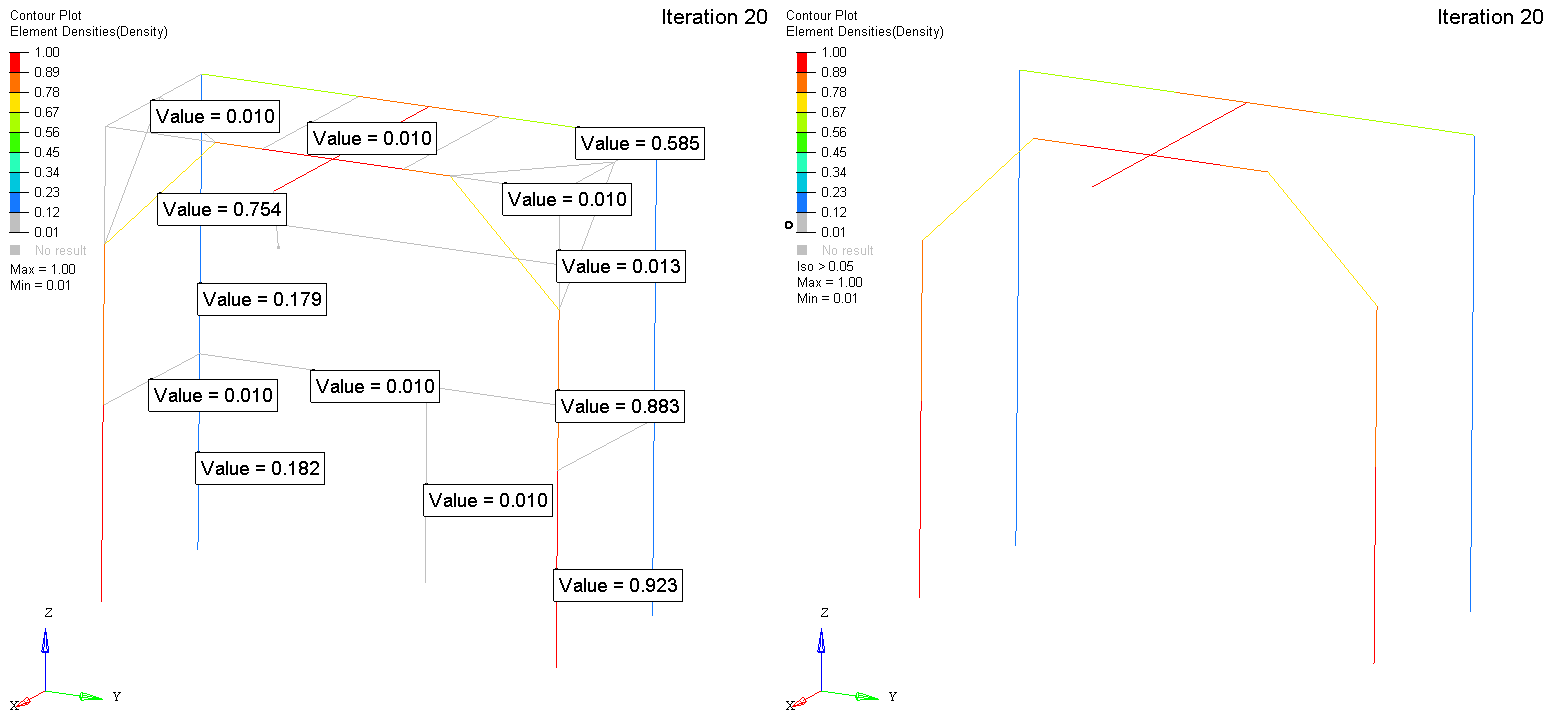 The results of this 1D optimization are compatible to the results seen in the previous analyses. Both the overall layout design and the removal of unnecessary beams appear in each of the results thus far.