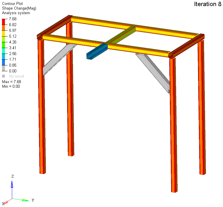 Size and shape optimization allows users to modify some parameters of the geometry to reach a more optimal design. Within the tubular structure, the cross-section of each tube can be modified in size, adjusting the overall dimensions, and shape, changing the tube to be square, rectangular, horizontal or vertical.The picture below shows how much the sections have grown in either direction to determine the lightest structure (about 60 lbs) that meets the requirements.