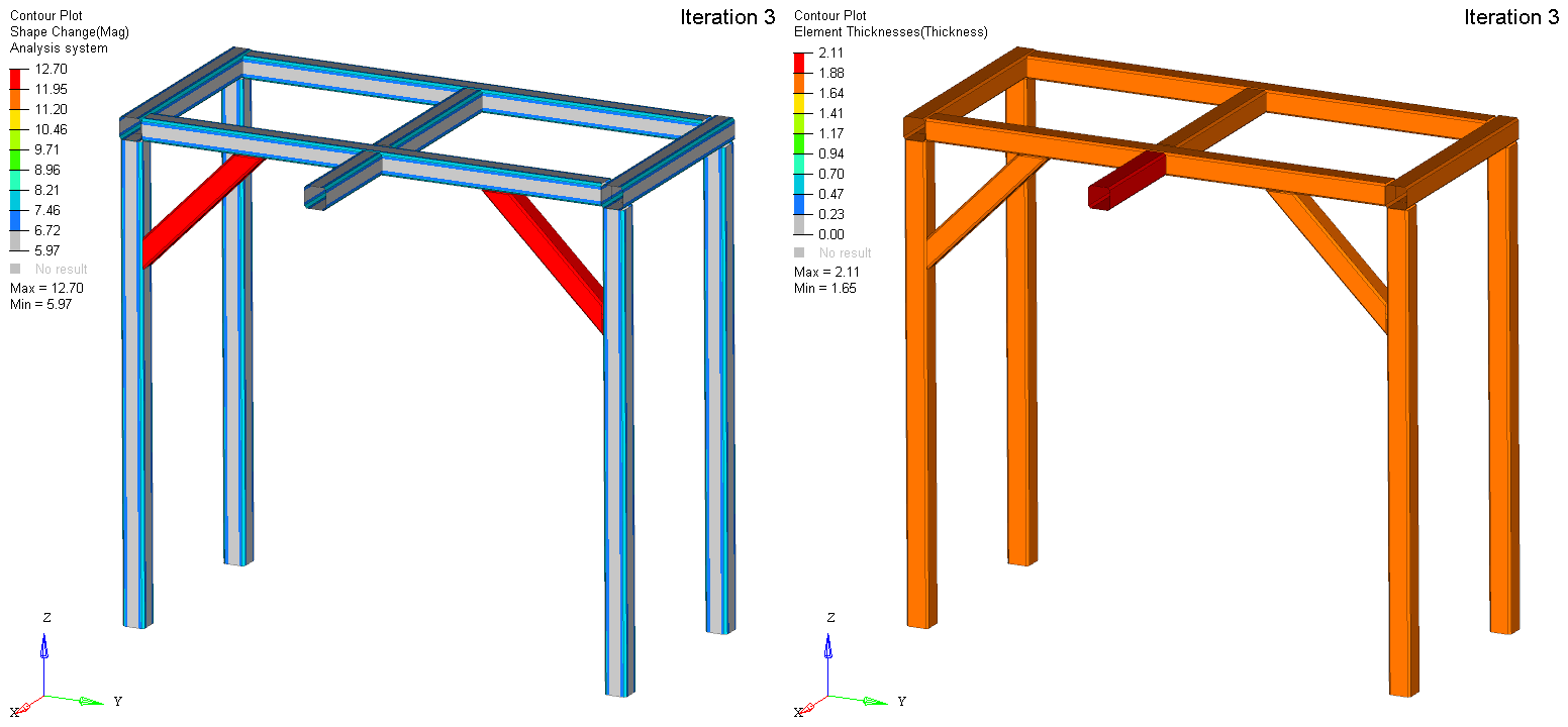 In size and shape analysis, parameters can be set to force the structure to use standard sized cross-sections and varying the gauges can also be added to the analysis for a more accessible solution. This picture shows the shape change on the left and the thickness value on the right for a final solution to the comprehensive size and shape optimization.