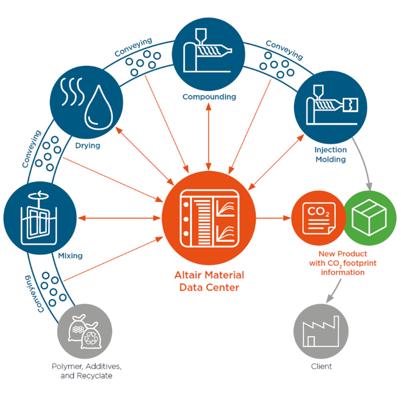 With material handling, mixing, drying, compounding, and injection molding, there are energy expenditures that must be allocated to the final product in the form of a CO2 footprint. Each step of the process requires precise operational parameters, which must be adjusted depending on the environmental conditions and the properties of the processed material. If users can capture the process’s energy demands and align that information with material-specific process parameters, users can identify and optimize inputs and processing.