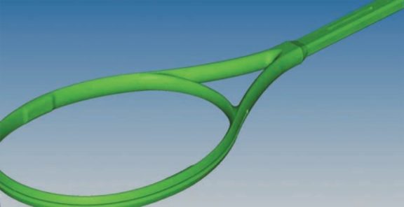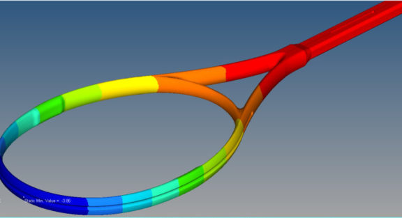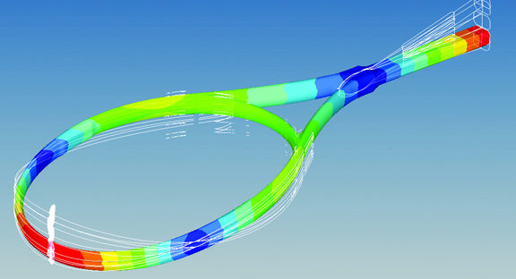 For each ply of the racquet’s laminate composite construction, the lay-up document was reviewed to understand the ply location, and then surfaces were trimmed and organized. Ply thicknesses were assigned, as were material properties, loads, and boundary conditions. Several analyses were performed using the structural analysis and optimization tools in HyperWorks, and results were validated to correlate with physical test data. Testing and analyses demonstrated the close correlation between the virtual model’s behaviors and real-life behaviors.