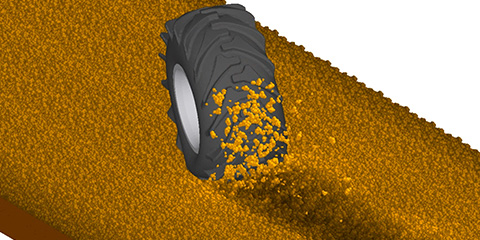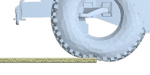 User-defined (meshed) 3D tire treads interact with the DEM particulate soil models and increase the ground contact modeling fidelity.